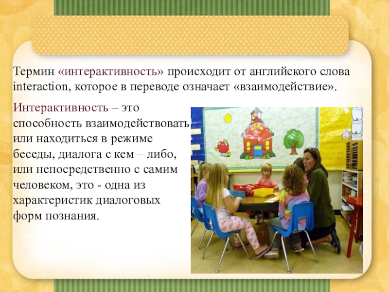 Интерактивность – это способность взаимодействовать или находиться в режиме беседы, диалога с кем – либо, или непосредственно с самим человеком, это - одна из характеристик диалоговых форм познания.