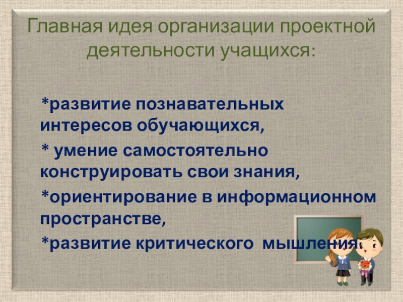 Слайд 6Главная идея организации проектной деятельности учащихся: