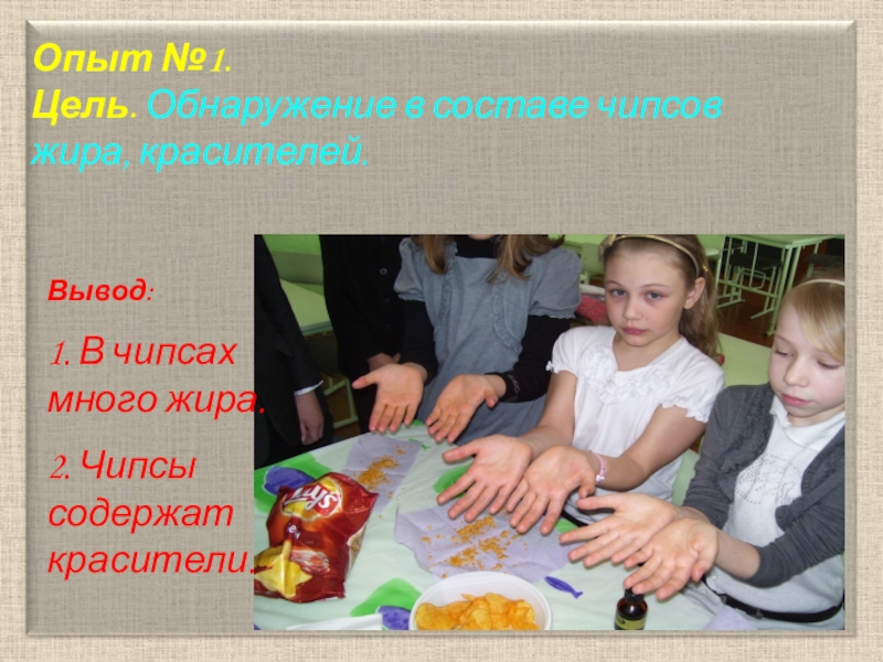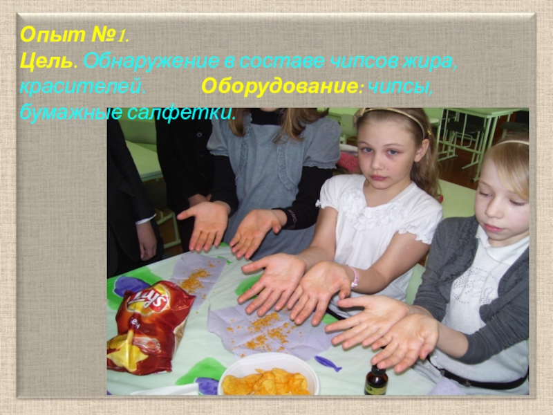 Цель. Обнаружение в составе чипсов жира, красителей. Оборудование: чипсы, бумажные салфетки.