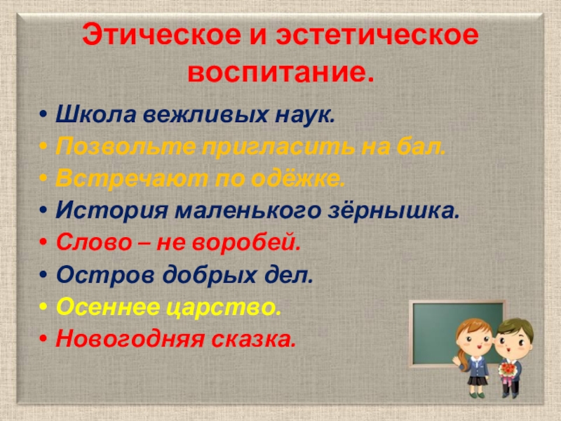 Слайд 25Этическое и эстетическое воспитание.