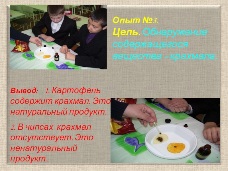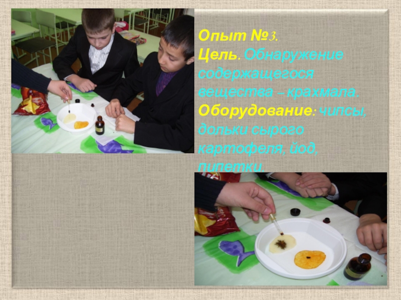 Цель. Обнаружение содержащегося вещества – крахмала. Оборудование: чипсы, дольки сырого картофеля, йод, пипетки.
