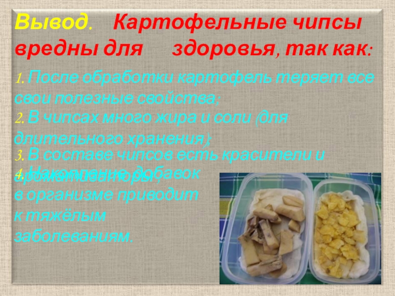 Слайд 19Вывод. Картофельные чипсы вредны для здоровья, так как: