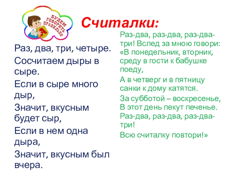 Раз-два, раз-два, раз-два-три! Вслед за мною говори: «В понедельник, вторник, среду в гости к бабушке поеду,