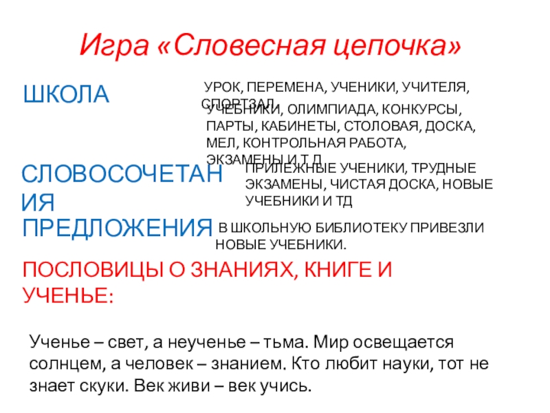 Ученье – свет, а неученье – тьма. Мир освещается солнцем, а человек – знанием. Кто любит науки, тот не знает скуки. Век живи – век учись.