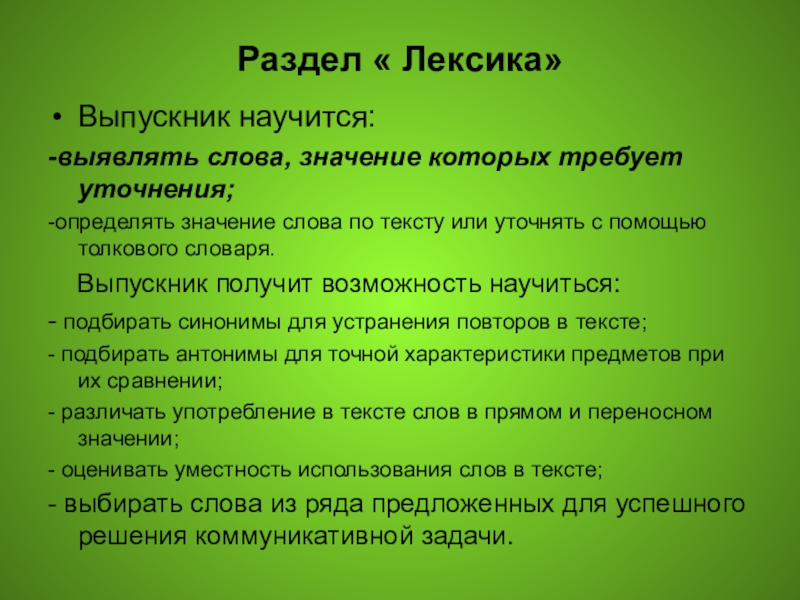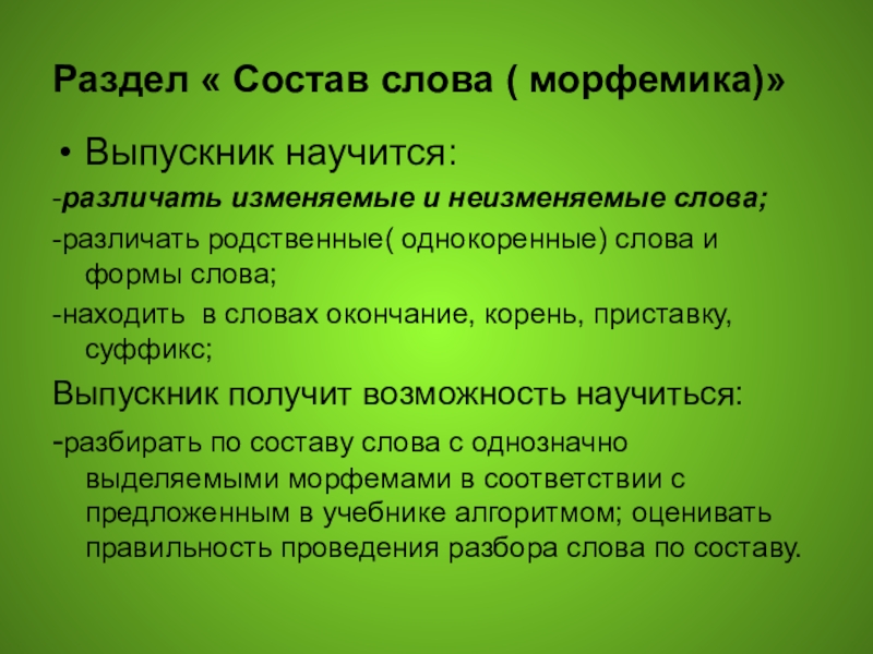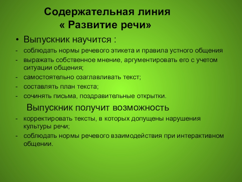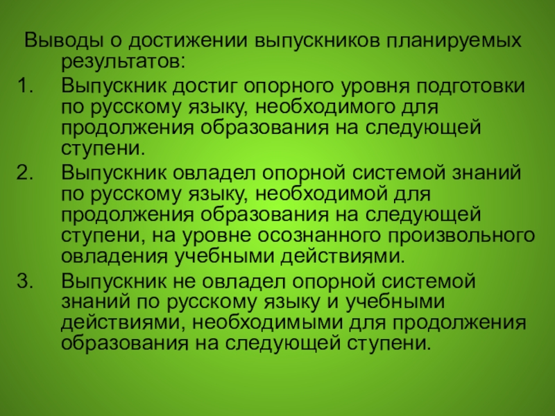Выпускник овладел опорной системой знаний по русскому языку, необходимой для продолжения образования на следующей ступени, на уровне осознанного произвольного овладения учебными действиями.