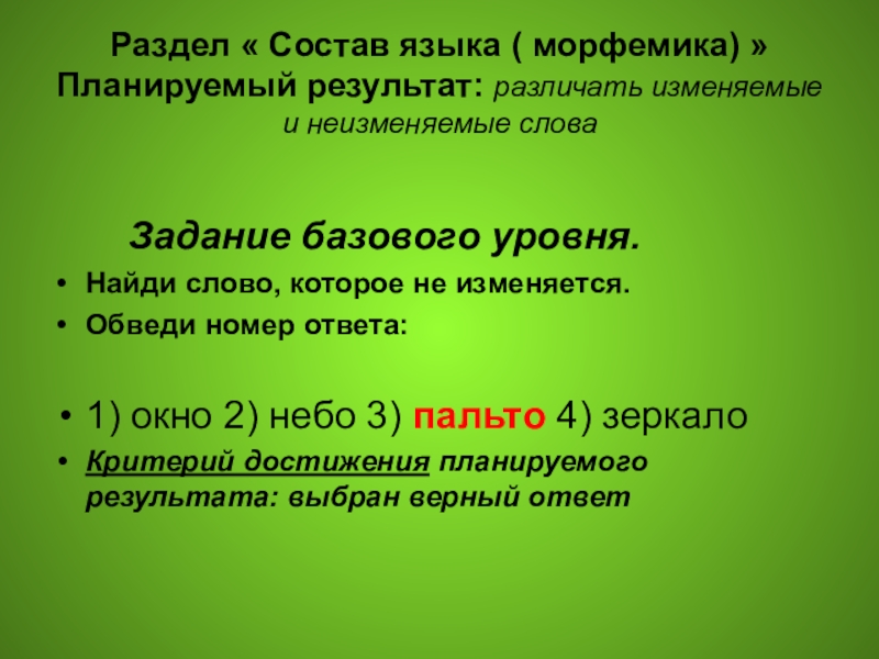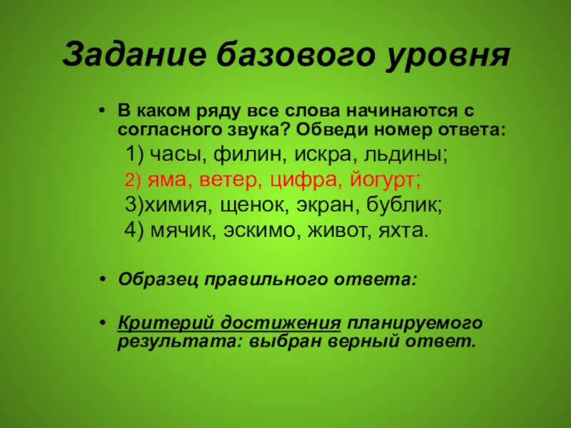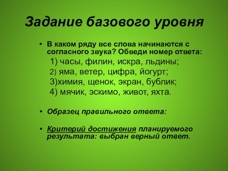3. выполнение каждого задания базового уровня сложности ( №1, 2, 4, 55, 7 – 10, 12, 13, 15, 18, 19) оценивается по дихотомической шкале: