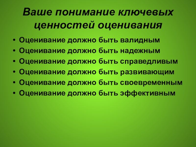 Слайд 59Ваше понимание ключевых ценностей оценивания