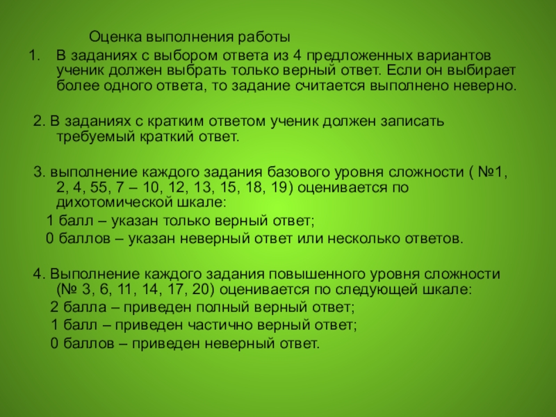 с выбором ответа из 4 предложенных вариантов ученик должен выбрать только верный ответ. Если он выбирает более одного ответа, то задание считается выполнено неверно.