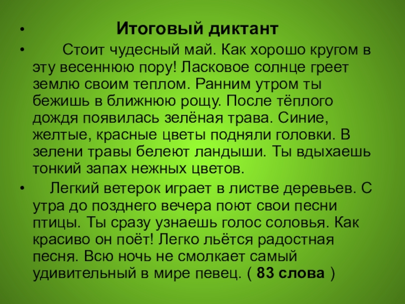 Легкий ветерок играет в листве деревьев. С утра до позднего вечера поют свои песни птицы. Ты сразу узнаешь голос соловья. Как красиво он поёт! Легко льётся радостная песня. Всю ночь не смолкает самый удивительный в мире певец. ( 83 слова )