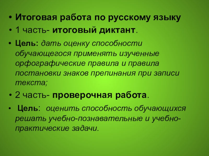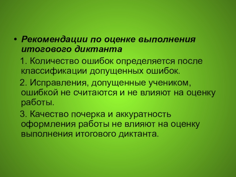 3. Качество почерка и аккуратность оформления работы не влияют на оценку выполнения итогового диктанта.