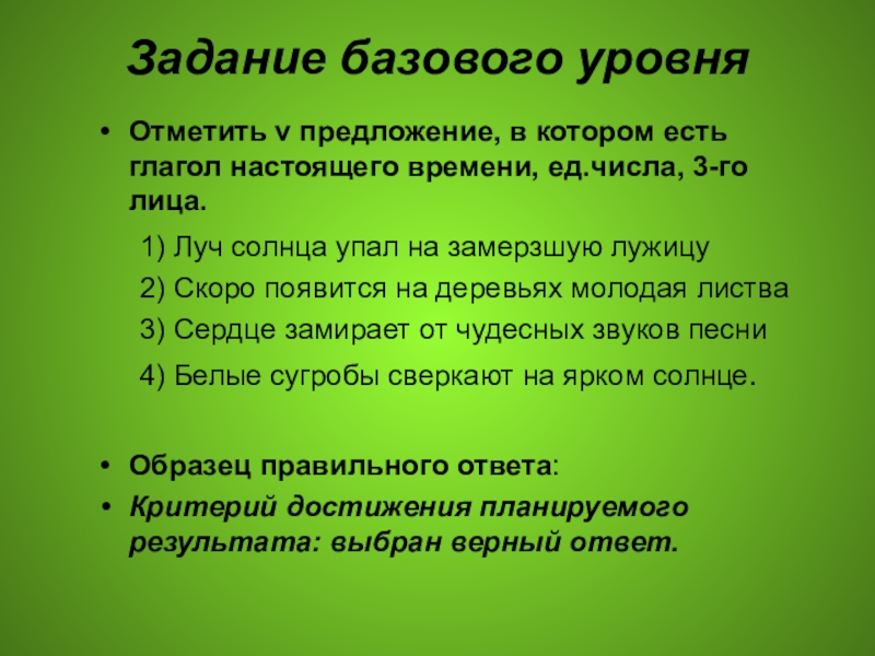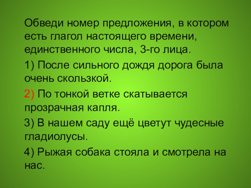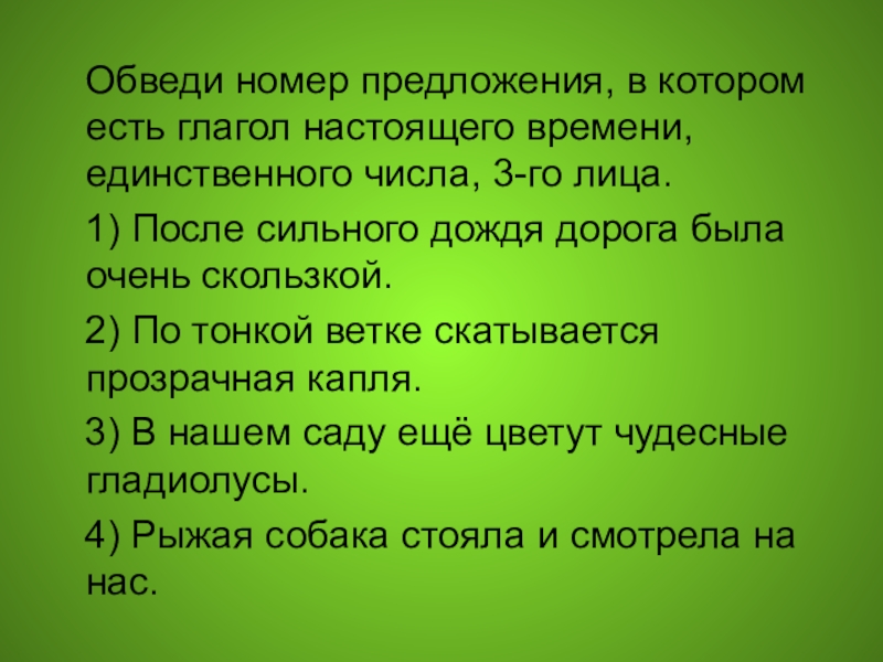 Обведи номер предложения, в котором есть глагол настоящего времени,