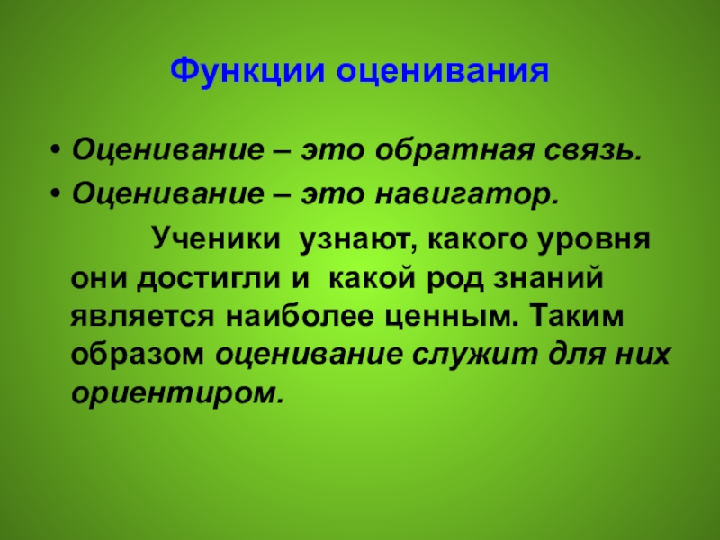 какого уровня они достигли и какой род знаний является наиболее ценным. Таким образом оценивание служит для них ориентиром.