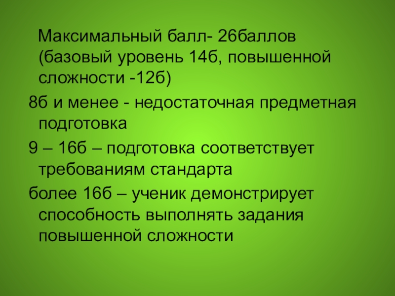 Максимальный балл- 26баллов (базовый уровень 14б, повышенной сложности -12б)