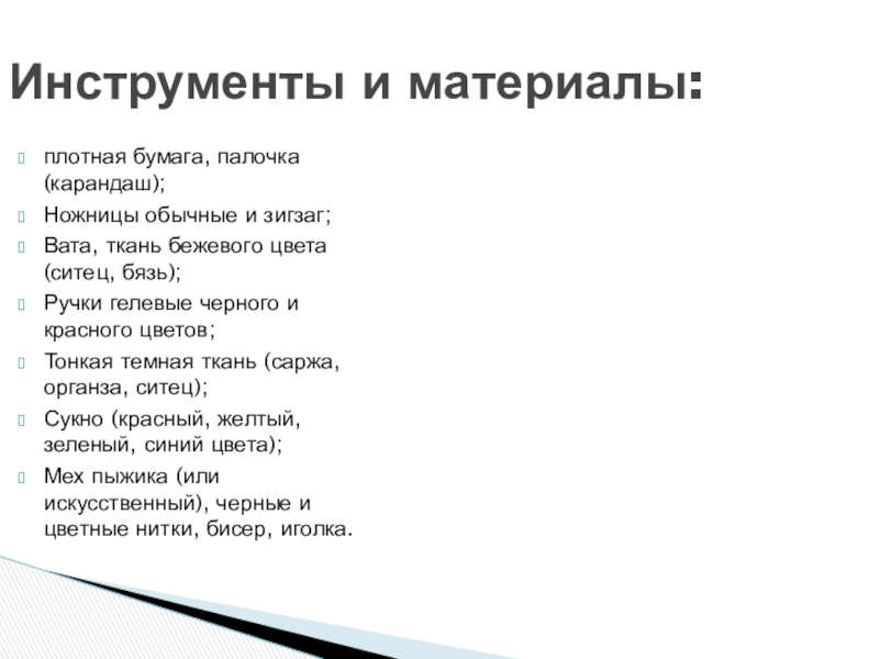 Инструменты и материалы:плотная бумага, палочка (карандаш);Ножницы обычные и зигзаг;Вата, ткань бежевого цвета (ситец, бязь);Ручки гелевые черного и красного цветов;Тонкая темная ткань (саржа, органза, ситец);Сукно (красный, желтый, зеленый, синий цвета);Мех пыжика (или искусственный), черные и цветные нитки,