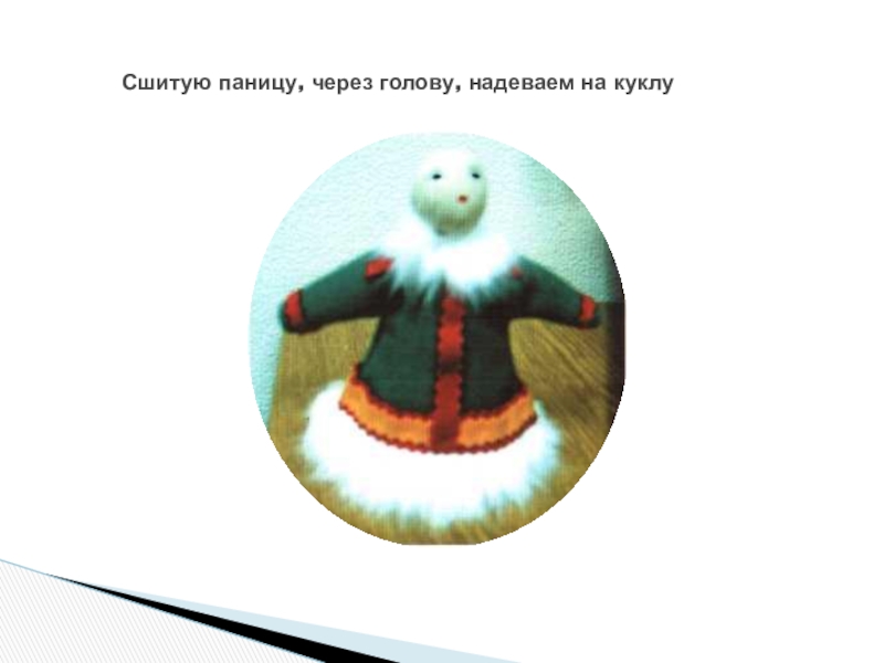 Слайд 8Сшитую паницу, через голову, надеваем на куклу