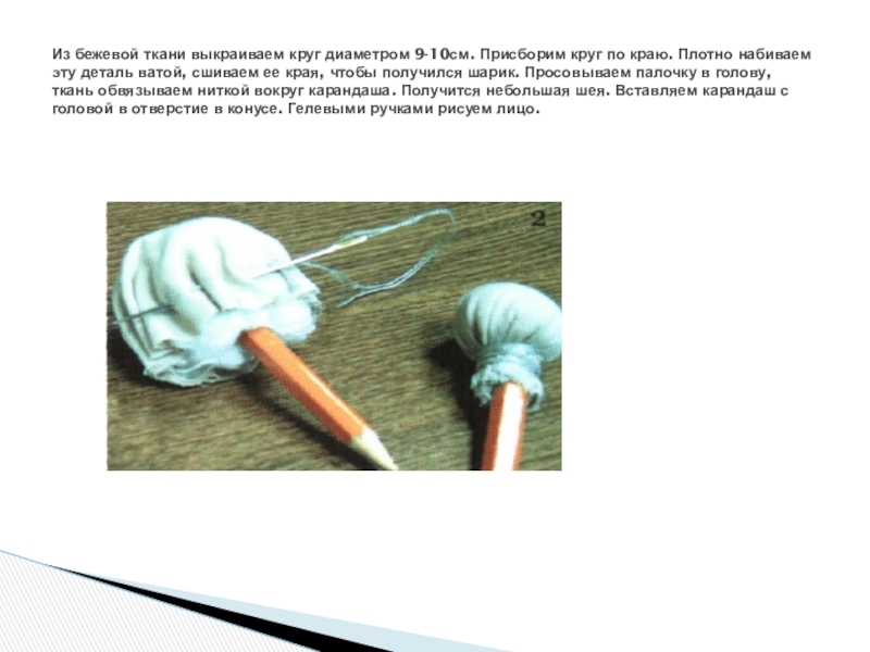 Плотно набиваем эту деталь ватой, сшиваем ее края, чтобы получился шарик. Просовываем палочку в голову, ткань обвязываем ниткой вокруг карандаша. Получится небольшая шея. Вставляем карандаш с головой в отверстие в конусе. Гелевыми ручками рисуем лицо.