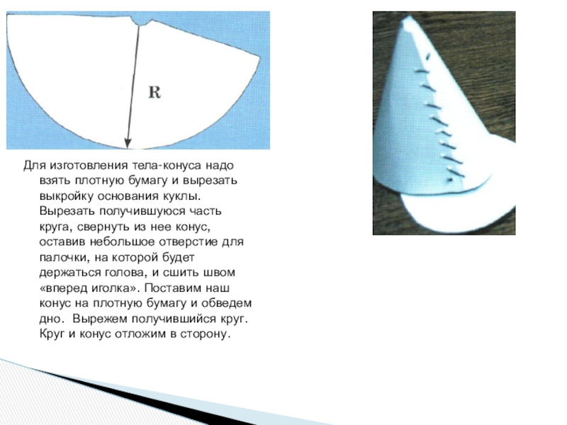 куклы. Вырезать получившуюся часть круга, свернуть из нее конус, оставив небольшое отверстие для палочки, на которой будет держаться голова, и сшить швом «вперед иголка». Поставим наш конус на плотную бумагу и обведем дно. Вырежем получившийся круг. Круг и конус отложим в сторону.