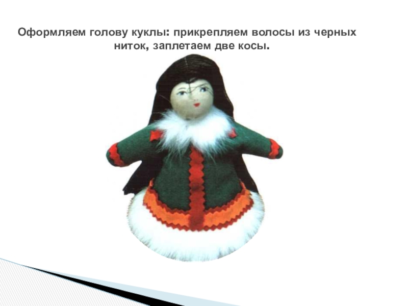Слайд 9 Оформляем голову куклы: прикрепляем волосы из черных