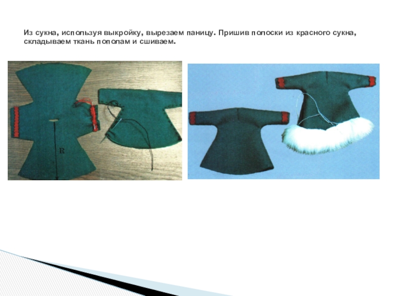 Слайд 6Из сукна, используя выкройку, вырезаем паницу. Пришив полоски из красного сукна,