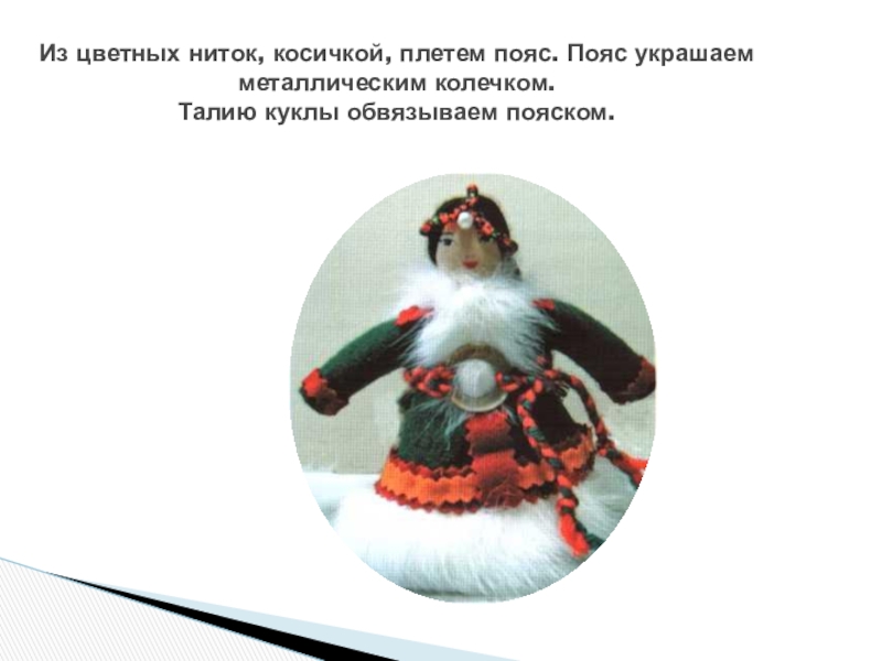 Слайд 10Из цветных ниток, косичкой, плетем пояс. Пояс украшаем металлическим колечком. Талию куклы