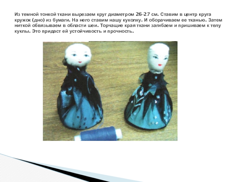 центр круга кружок (дно) из бумаги. На него ставим нашу куколку. И оборачиваем ее тканью. Затем ниткой обвязываем в области шеи. Торчащие края ткани загибаем и пришиваем к телу куклы. Это придаст ей устойчивость и прочность.