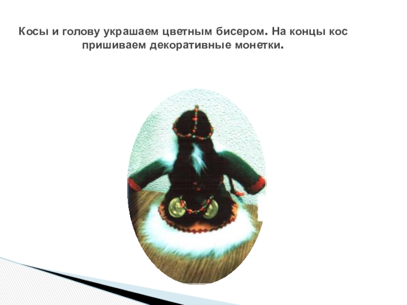 Слайд 11Косы и голову украшаем цветным бисером. На концы кос пришиваем декоративные