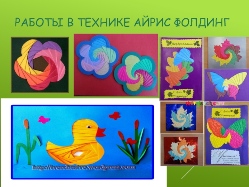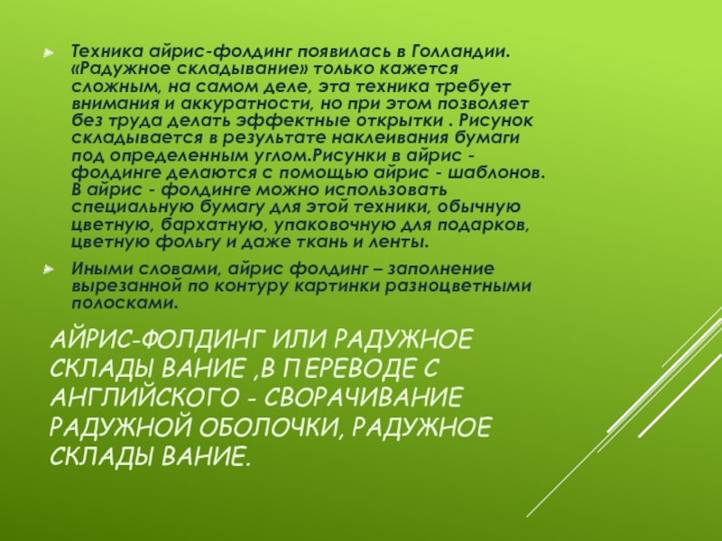 Техника айрис-фолдинг появилась в Голландии. «Радужное складывание» только кажется сложным, на самом деле, эта техника требует внимания и аккуратности, но при этом позволяет без труда делать эффектные открытки . Рисунок складывается в результате наклеивания бумаги под определенным углом.Рисунки в айрис - фолдинге делаются с помощью айрис - шаблонов. В айрис - фолдинге можно использовать специальную бумагу для этой техники, обычную цветную, бархатную, упаковочную для подарков, цветную фольгу и даже ткань и ленты.
