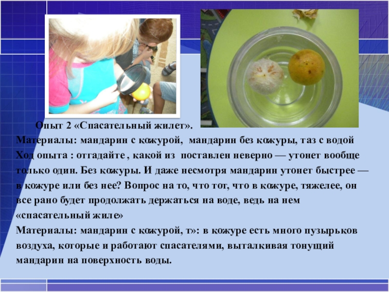 Материалы: мандарин с кожурой, т»: в кожуре есть много пузырьков воздуха, которые и работают спасателями, выталкивая тонущий мандарин на поверхность воды.