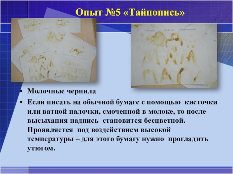 кисточки или ватной палочки, смоченной в молоке, то после высыхания надпись становится бесцветной. Проявляется под воздействием высокой температуры – для этого бумагу нужно прогладить утюгом.
