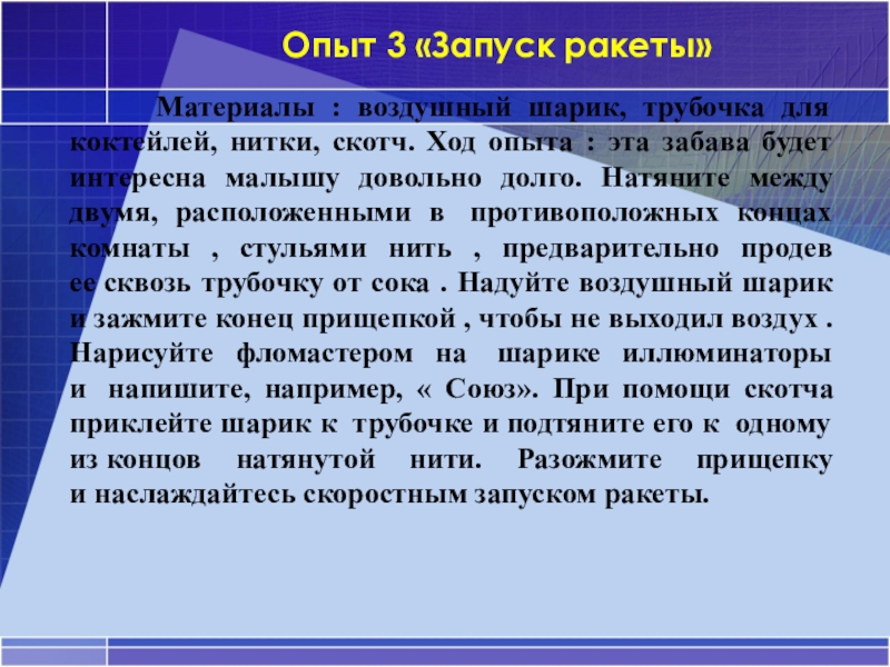 воздушный шарик, трубочка для коктейлей, нитки, скотч. Ход опыта : эта забава будет интересна малышу довольно долго. Натяните между двумя, расположенными в противоположных концах комнаты , стульями нить , предварительно продев ее сквозь трубочку от сока . Надуйте воздушный шарик и зажмите конец прищепкой , чтобы не выходил воздух . Нарисуйте фломастером на шарике иллюминаторы и напишите, например, « Союз». При помощи скотча приклейте шарик к трубочке и подтяните его к одному из концов натянутой нити. Разожмите прищепку и наслаждайтесь скоростным запуском ракеты.