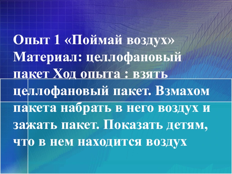 Слайд 6Опыт 1 «Поймай воздух» Материал: целлофановый пакет Ход опыта : взять