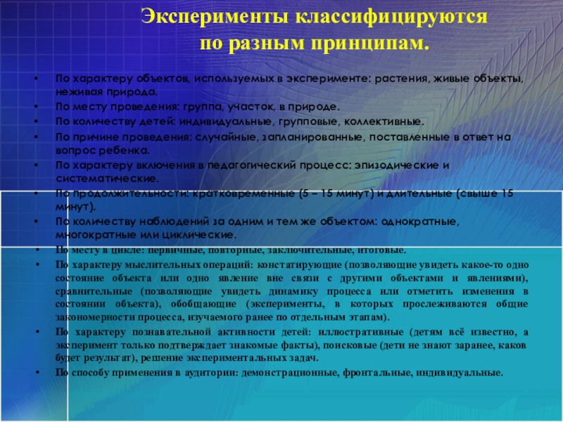 По характеру мыслительных операций: констатирующие (позволяющие увидеть какое-то одно состояние объекта или одно явление вне связи с другими объектами и явлениями), сравнительные (позволяющие увидеть динамику процесса или отметить изменения в состоянии объекта), обобщающие (эксперименты, в которых прослеживаются общие закономерности процесса, изучаемого ранее по отдельным этапам).