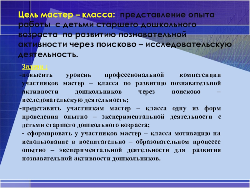 повысить уровень профессиональной компетенции участников мастер – класса по развитию познавательной активности дошкольников через поисково – исследовательскую деятельность;