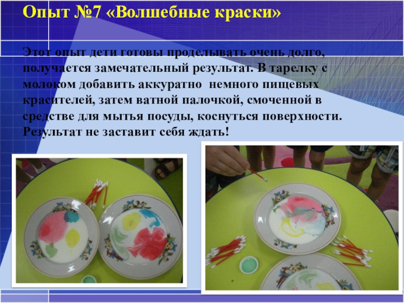 получается замечательный результат. В тарелку с молоком добавить аккуратно немного пищевых красителей, затем ватной палочкой, смоченной в средстве для мытья посуды, коснуться поверхности. Результат не заставит себя ждать!