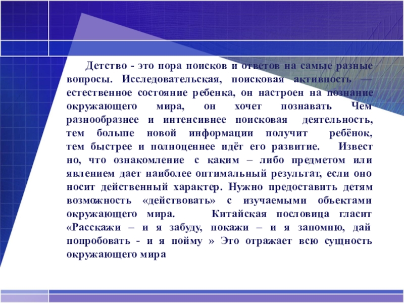 поисков и ответов на самые разные вопросы. Исследовательская, поисковая активность — естественное состояние ребенка, он настроен на познание окружающего мира, он хочет познавать Чем разнообразнее и интенсивнее поисковая деятельность, тем больше новой информации получит ребёнок, тем быстрее и полноценнее идёт его развитие. Известно, что ознакомление с каким – либо предметом или явлением дает наиболее оптимальный результат, если оно носит действенный характер. Нужно предоставить детям возможность «действовать» с изучаемыми объектами окружающего мира. Китайская пословица гласит «Расскажи – и я забуду, покажи – и я запомню, дай попробовать - и я пойму » Это отражает всю сущность окружающего мира