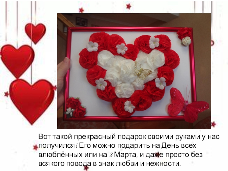 Вот такой прекрасный подарок своими руками у нас получился! Его можно подарить на День всех влюблённых или на 8 Марта, и даже просто без всякого повода в знак любви и нежности.