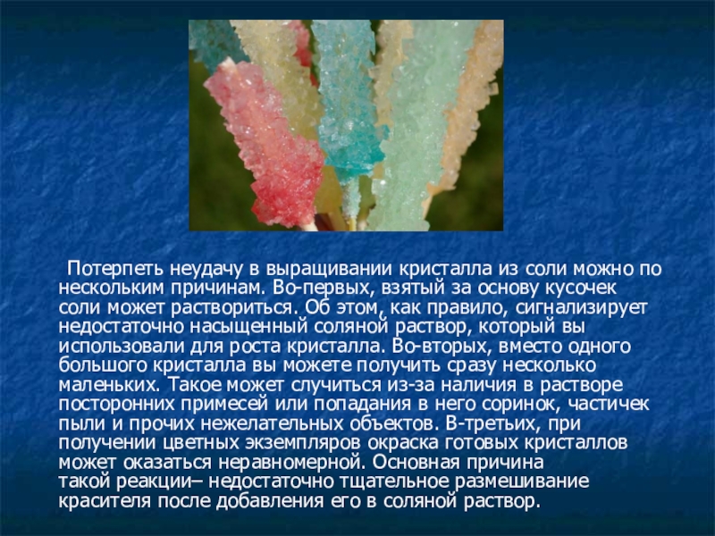 Слайд 12 Потерпеть неудачу в выращивании кристалла из соли можно по нескольким причинам.