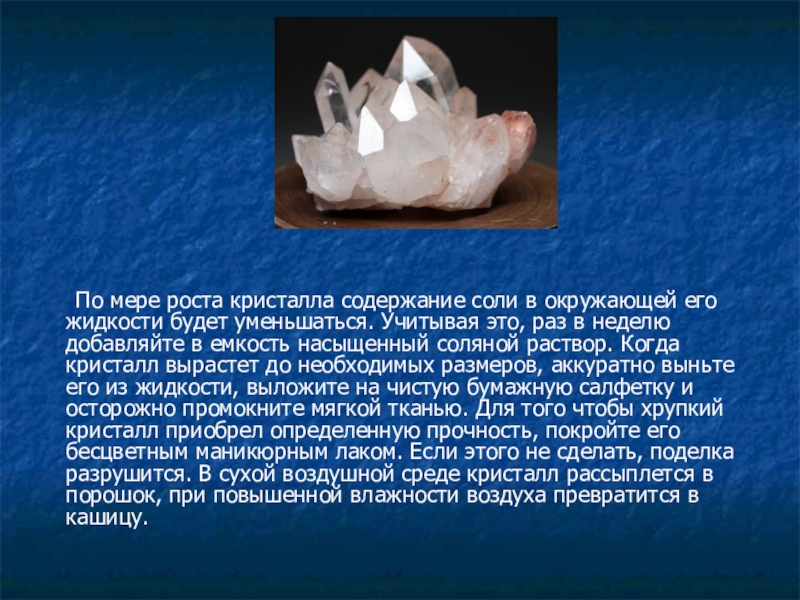 уменьшаться. Учитывая это, раз в неделю добавляйте в емкость насыщенный соляной раствор. Когда кристалл вырастет до необходимых размеров, аккуратно выньте его из жидкости, выложите на чистую бумажную салфетку и осторожно промокните мягкой тканью. Для того чтобы хрупкий кристалл приобрел определенную прочность, покройте его бесцветным маникюрным лаком. Если этого не сделать, поделка разрушится. В сухой воздушной среде кристалл рассыплется в порошок, при повышенной влажности воздуха превратится в кашицу.
