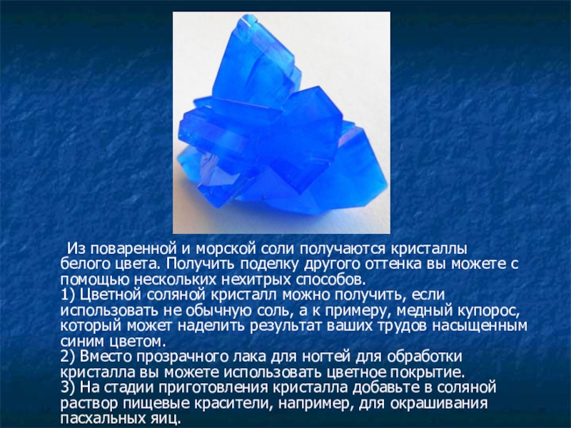 Слайд 10 Из поваренной и морской соли получаются кристаллы белого цвета. Получить поделку другого