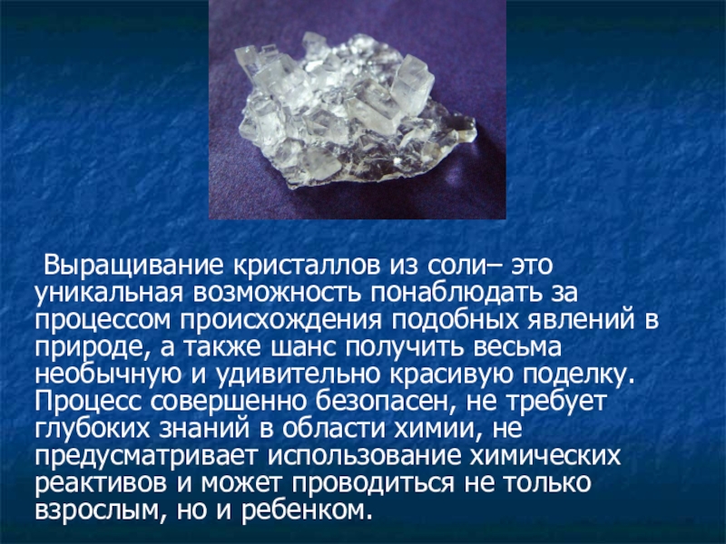 Слайд 4 Выращивание кристаллов из соли– это уникальная возможность понаблюдать за процессом происхождения