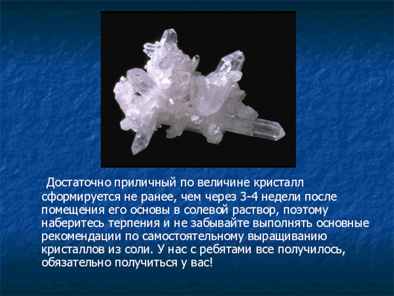 Слайд 13 Достаточно приличный по величине кристалл сформируется не ранее, чем через 3-4 недели после
