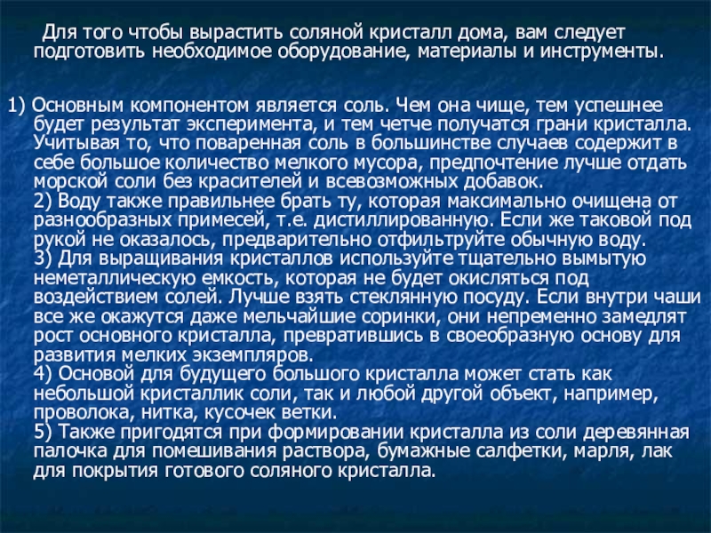 Слайд 5 Для того чтобы вырастить соляной кристалл дома, вам следует подготовить необходимое
