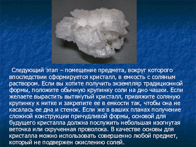 Слайд 7 Следующий этап – помещение предмета, вокруг которого впоследствии сформируется кристалл, в