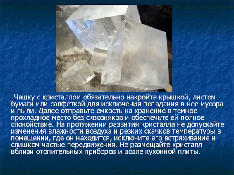 исключения попадания в нее мусора и пыли. Далее отправьте емкость на хранение в темное прохладное место без сквозняков и обеспечьте ей полное спокойствие. На протяжении развития кристалла не допускайте изменения влажности воздуха и резких скачков температуры в помещении, где он находится, исключите его встряхивание и слишком частые передвижения. Не размещайте кристалл вблизи отопительных приборов и возле кухонной плиты.