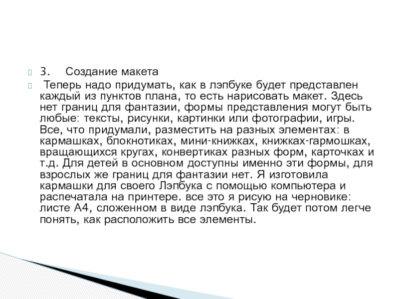 пунктов плана, то есть нарисовать макет. Здесь нет границ для фантазии, формы представления могут быть любые: тексты, рисунки, картинки или фотографии, игры. Все, что придумали, разместить на разных элементах: в кармашках, блокнотиках, мини-книжках, книжках-гармошках, вращающихся кругах, конвертиках разных форм, карточках и т.д. Для детей в основном доступны именно эти формы, для взрослых же границ для фантазии нет. Я изготовила кармашки для своего Лэпбука с помощью компьютера и распечатала на принтере. все это я рисую на черновике: листе А4, сложенном в виде лэпбука. Так будет потом легче понять, как расположить все элементы.