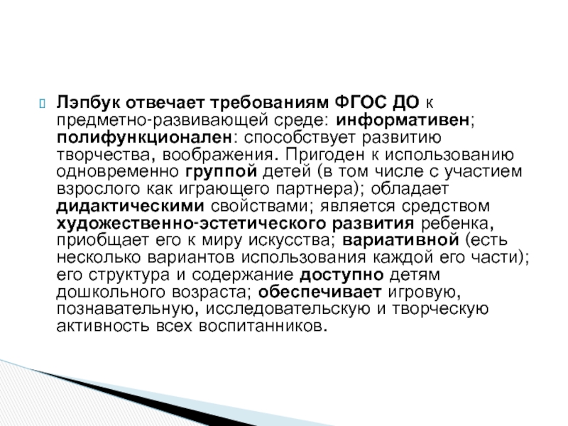Слайд 3Лэпбук отвечает требованиям ФГОС ДО к предметно-развивающей среде: информативен; полифункционален: способствует