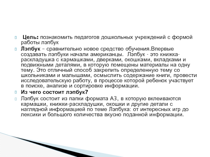 Слайд 2 Цель: познакомить педагогов дошкольных учреждений с формой работы лэпбук