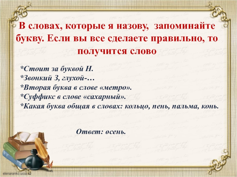 *Какая буква общая в словах: кольцо, пень, пальма, конь.