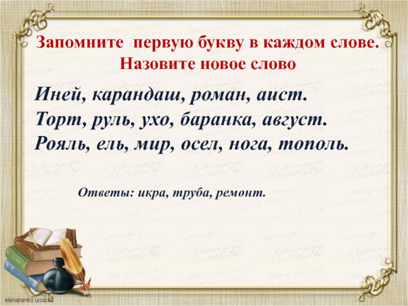 Ответы: икра, труба, ремонт.