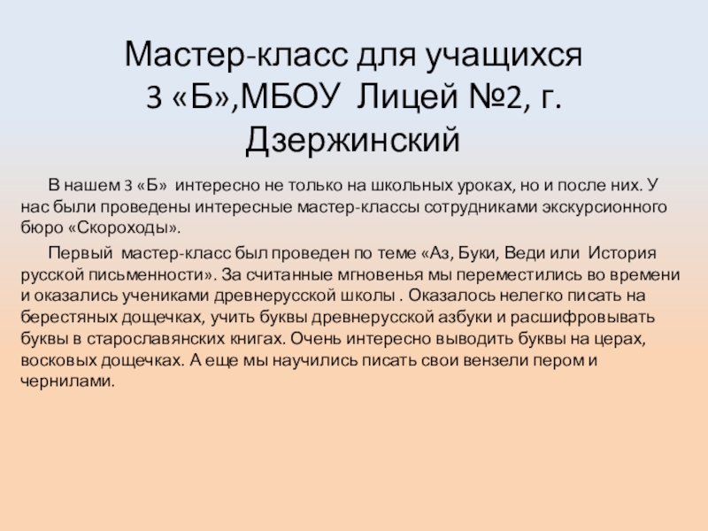 В нашем 3 «Б» интересно не только на школьных уроках, но и после них. У нас были проведены интересные мастер-классы сотрудниками экскурсионного бюро «Скороходы».